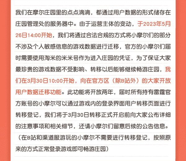 2023年3月24日,,,,雷霆游戲和淘米游戲同時官宣::由于淘米游戲授權雷霆游戲發行的《摩爾莊園》手游項目合約即將到期、、淘米對摩爾莊園的IP發展和游戲運營有進一步的規劃,,,,經過雙方充分友好的溝通,,,,決定在合約到期后結束合作,,《摩爾莊園》手游將在2023年5月26日起移交淘米游戲發行運營。。。