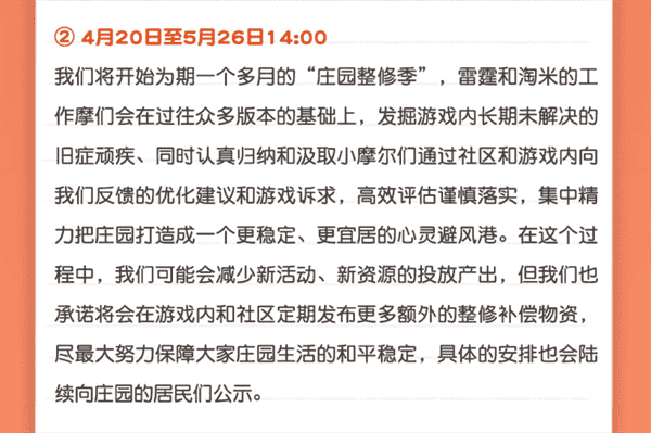 合作的結束并不意味著這個童年IP的結束,,,對于《摩爾莊園》手游而言,,這是一個新階段的開始。。后續游戲內將開啟莊園重構計劃,,,會就以往遺留下來的BUG進行集中修復,,并在游戲內和社區定期發布更多補償物資。。。