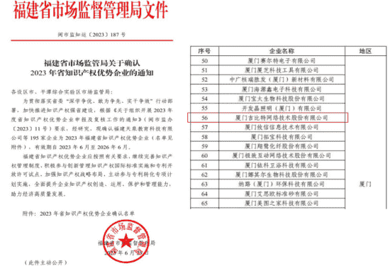 近日,,,,福建省市場監督管理局公示了2023年福建省知識產權優勢企業名單,,,,廈門一競技網絡技術股份有限公司(以下簡稱“一競技”或“公司”)榜上有名。。